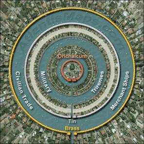 protetta da alte mura e da un anello di acqua. La seconda isola (il primo anello di terra) era riservato ai templi e qui i sacerdoti conducevano rituali e sacrifici. Il secondo anello di acqua era riservato alla marina militare atlantidea, e qui erano custodite almeno 12.000 imbarcazioni. Nel secondo anello di terra risiedeva l’esercito, che contava ben 240.000 unità. Il terzo anello di acqua ospitava il porto mercantile oltre ai mezzi di trasporto pubblici (perlopiù traghetti). Il terzo e ultimo anello di terra ospitava il centro città, sempre affollato (sia di giorno che di notte).