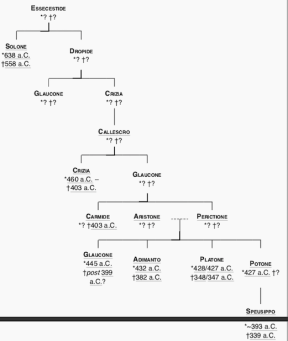 dove per la prima volta Platone fa riferimento ad Atlantide, scritti che hanno permesso a noi tutti oggi di conoscere il “mito” di Atlantide. Platone asserisce che la conoscenza del continente perduto è arrivata a lui tramite un suo lontano parente, Solone, legislatore e poeta vissuto tra il 615 e il 535 a.C. (vedi tavola genealogica di Platone), considerato l’inventore della democrazia. Solone, in uno dei suoi tanti viaggi, nel 590 a.C. circa, giunse fino in Egitto, dove fu accolto positivamente dai sacerdoti della città di Sais, preceduto dalla sua fama di sapiente (del tempio di Sais non rimane nulla e oggi sappiamo che è veramente esistito grazie alla testimonianza di Platone). Solone voleva conoscere la verità sull’origine dell’umanità e così si rivolse ad un sacerdote egizio del tempio di Sais, grazie al quale venne a sapere dell’esistenza di una civiltà molto antica, risalente a 9000 anni prima, ovvero Atlantide. A Solone il sacerdote disse che la Grecia e la città di Atene erano molto più antiche di quanto non credessero i greci stessi, e che periodicamente avvengono cataclismi globali che spazzano via intere civiltà