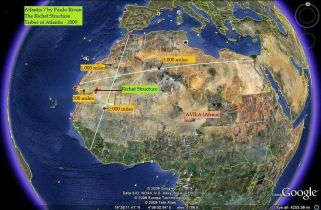Atlantide. Queste sono anche le dimensioni della Struttura di Richat in Mauritania! Intorno alla città, e più precisamente a Nord c’erano anche delle montagne sulle quali scorrevano grandi fiumi e la città era collegata col mare tramite uno stretto posizionato a Sud (vedi descrizione di Platone). Questa descrizione corrisponde perfettamente con quella della Struttura di Richat, in Mauritania (Africa occidentale), un luogo dove sono stati rinvenuti moltissimi manufatti antichi, datati circa 12.000 anni fa. Questo è il sito archeologico più ricco di tutto il mondo, e ciò avrebbe senso se consideriamo che Platone racconta come Atlantide ospitasse un milione di abitanti. Platone afferma che ad Atlantide c’erano molti elefanti, e George e Natalis hanno scoperto che nelle immediate vicinanze del Richat sono stati rinvenuti resti di molti animali, tra cui elefanti e proprio elefanti e giraffe sono il soggetto delle pitture rupestri presenti nell’area circostante a Richat; ciò fa pensare che un tempo qui esistevano molti elefanti (ancora oggi ci sono molti elefanti in Mauritania), come nella capitale di Atlantide descritta da Platone. Inoltre ad Atlantide erano presenti in grandi quantità rame e oro, e oggi la Mauritania è una grande esportatrice di metalli quali rame, ferro e oro. Il primo re della Mauritania si chiamava Atlas…sarà una semplice coincidenza (vedi storia di Atlantide raccontata da Platone)?