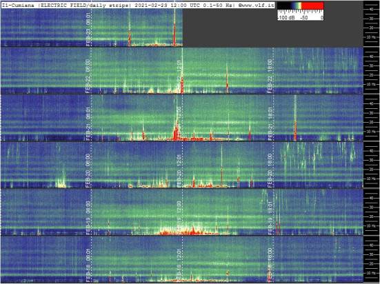 Queste sono le rilevazioni dell’Università di Tomsk in Russia, ho scelto queste perché le trovo più facilmente comprensibili e anche “poetiche” dato che è possibile leggere sia i fasci luminosi che le parti rosse e colorate come messaggi cifrati all’umanità sensibile. Ma esiste anche il centro italiano (molto in vista) che si trova a Cumiana, in provincia di Torino (vlf.it cumiana). Con questo tipo di grafico è però più difficile comprendere al livello energetico ciò che sta avvenendo: