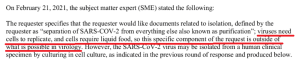 Thus far (May 22, 2021) 25 Canadian institutions have provided their responses: Public Health Agency of Canada, Health Canada, the National Research Council of Canada, Vaccine and Infectious Disease Organization-International Vaccine Centre (VIDO-InterVac), Canadian Institutes of Health Research, Natural Sciences and Engineering Research Council of Canada, Ontario Ministry of Health, Institut National de Sante Publique du Quebec, British Columbia’s Ministry of Health (re “the UK variant”), British Columbia’s Centre for Disease Control, British Columbia’s Provincial Health Services Authority (2 responses, 1 re “SARS-COV-2, 1 re “the UK variant”), Vancouver Coastal Health Authority (re “the UK variant”), Newfoundland Labrador Department of Health & Community Services, McGill University, the City of Toronto, Toronto Police, the Region of Peel (Ontario), KFL&A Public Health (Kingston, Frontenac, Lennox and Addington, Ontario, re “any variant”), Grey Bruce Health Services, Peterborough Public Health (Ontario), Peterborough Police Service (Ontario), the University of Toronto, Sunnybrook Health Sciences Centre, McMaster University and Mount Sinai Hospital (Toronto) (note that researchers from the last 4 institutions had publicly claimed to have “isolated the virus”, as had VIDO- Intervac).