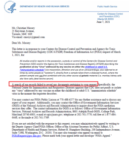 Questa è la risposta alla richiesta di indicare documenti che attestino e descrivino l’avvenuta purificazione di tutti i “virus” per i quali sono stati formulati dei vaccini secondo il programma di immunizzazione di adulti e bambini del CDC negli Stati Uniti. La Massey aveva chiesto se hanno la prova che qualcuno sia mai riuscito ad isolare i supposti virus tramite macerazione, filtraggio e tramite l’utilizzo di un’ultracentrifuga: azioni che per alcuni costituiscono prova dell’avvenuto “isolamento”, direttamente da un campione prelevato da un paziente malato, e in cui il fluido della persona non sia stato prima mescolato con qualsiasi altra fonte di materiale genetico (ossia cellule renali di scimmia o cellule Vero e siero fetale bovino).