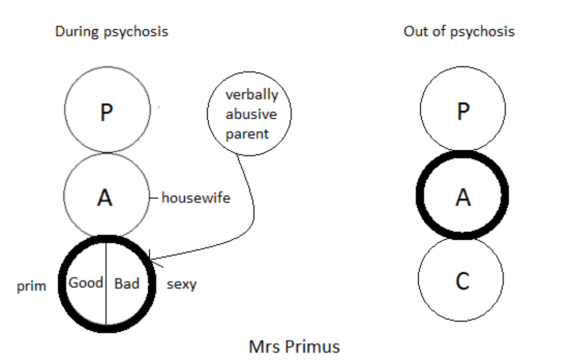 Il diagramma di sinistra mostra la Signora Primus durante la Psicosi – in alto il primo cerchio è quello del Genitore (Parent), il secondo è quello dell’Adulto (Adult – la casalinga pudica) e l’ultimo è quello del Bambino (Child), il quale è diviso fra Bambino Positivo e Negativo, dove quello negativo contiene le registrazioni del padre verbalmente violento, le quali costituiscono i contenuti delle allucinazioni della donna, e che corrispondono alla parte sexy, fuori controllo. Invece il diagramma di destra mostra la Signora Primus quando NON è preda della Psicosi, e quindi ha un Adulto funzionante (corrispondente alla figura della casalinga).