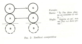 In un RAPPORTO SIMBIOTICO ogni partecipante usa solamente una parte delle proprie abilità o della sua struttura interna, e così UNA MINACCIA PER UNO, DIVENTA UNA MINACCIA PER ENTRAMBI (perché i due sono un uno). Così si hanno pochissime alternative a disposizione, in quanto la capacità di pensare in modo autonomo viene soppressa a causa della necessità di proteggere l’altro partecipante alla simbiosi (l’uno senza l’altro non vive, e quindi si cerca di evitare a tutti i costi che l’altro “muoia”). L’efficienza nel risolvere un problema è limitata dal fatto di avere un’unica visione di ogni aspetto del problema, visto che non ci sono due visioni diverse da confrontare o integrare, per poi giungere ad una soluzione innovativa.