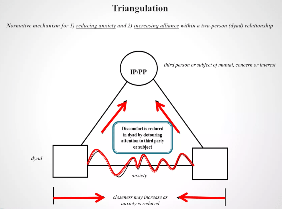 Chi viene coinvolto in un Triangolo Emotivo si sente come “preso in mezzo” fra la coppia: nella Triangolazione il terzo assorbe le energie in eccesso che emergono dalla prima diade (coppia), permettendo così alla coppia di restare unita. Il conflitto si localizza quindi sul soggetto più debole e “inadeguato” del Triangolo.